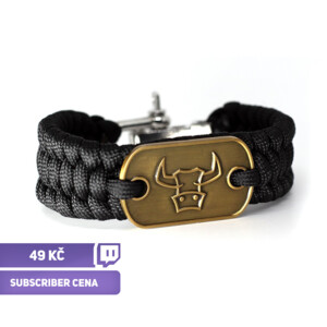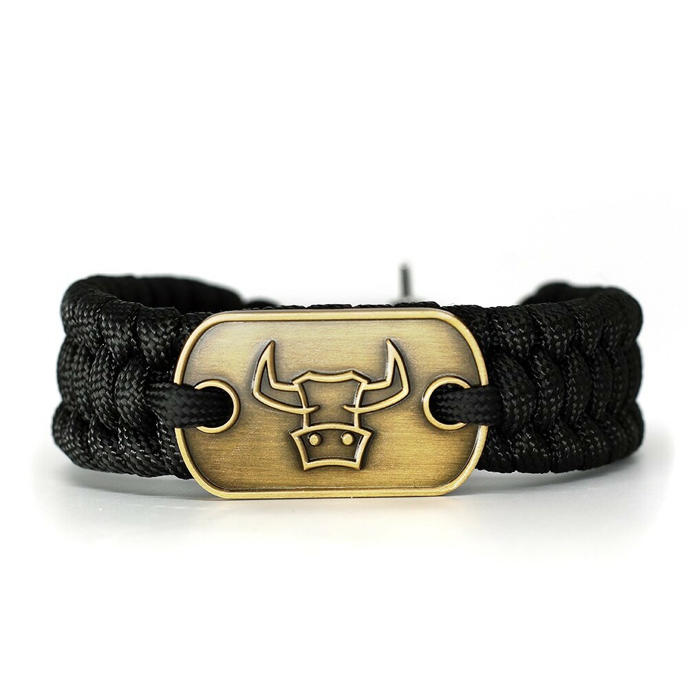 Černý paracordový náramek s logem Arcadebulls vyvedeným na kovovém odznaku se staro-měděným odstínem.