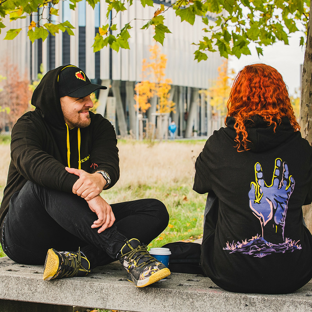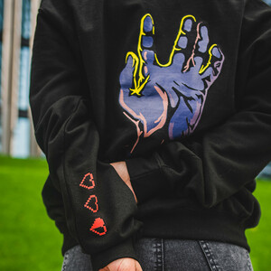 Super příjemná mikina ze směsi 80% bavlny a 20% polyesteru s celkovou gramáží 280gms v černé barvě. Kapuca je podšitá žlutě a našim oblíbeným easter eggem jsou srdíčka na vnitřní straně levého předloktí.
