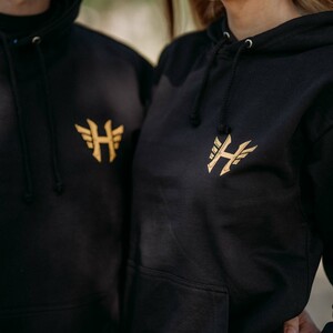 Kvalitní mikina unisexového střihu s velkou kapsou na přední straně a s kapucí se stahovací šňůrkou.