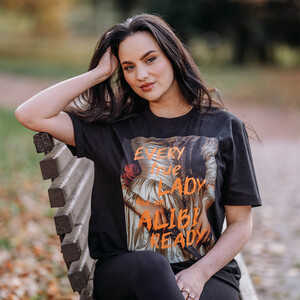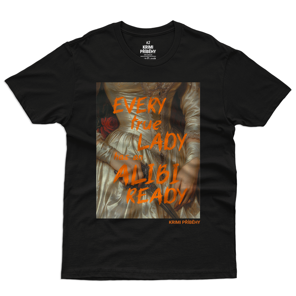 Stylové tričko Krimi Příběhy přináší tajemný a osobitý design. Černé tričko zdobí obraz ženy, v jejíž ruce se leskne dýka, zatímco přes celý obraz se táhne provokativní nápis „Every TRUE LADY has an ALIBI READY“. Tričko Krimi Příběhy osloví fanoušky, kteří se zajímají o tajemství, příběhy a napětí. Motiv je elegantní i temný zároveň, a tak se hodí pro každého, kdo ocení výrazný kousek s příběhem.