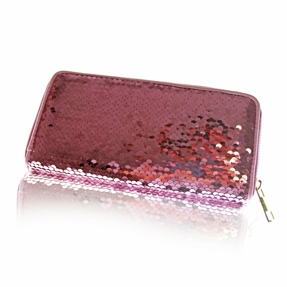 Nová krásná peněženka s růžovo-stříbrnými flipovacími flitry a kovovým ornamentem Lea.