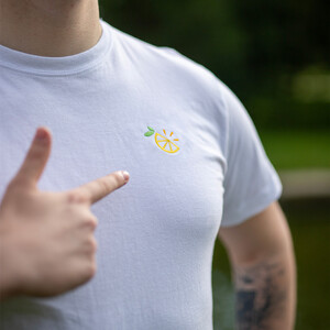 Nové bílé tričko s fresh designem! Minimalistická výšivka, skrytý podpis za krkem a žlutý textilní štítek se hodí ke každé příležitosti. Ideální citronový motiv nejen na léto.