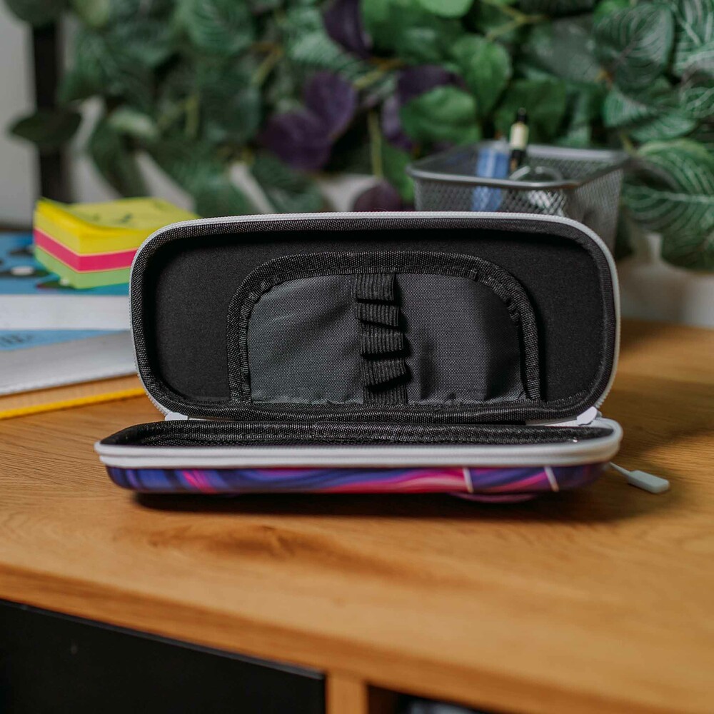 Penál o rozměrech 23x 10 cm z odolné a na dotek příjemné EVA pěny, který má vnitřní kapsu na zip a malý oddělovač s pořadačem na tužky. Penál se zasílá nevybavený.