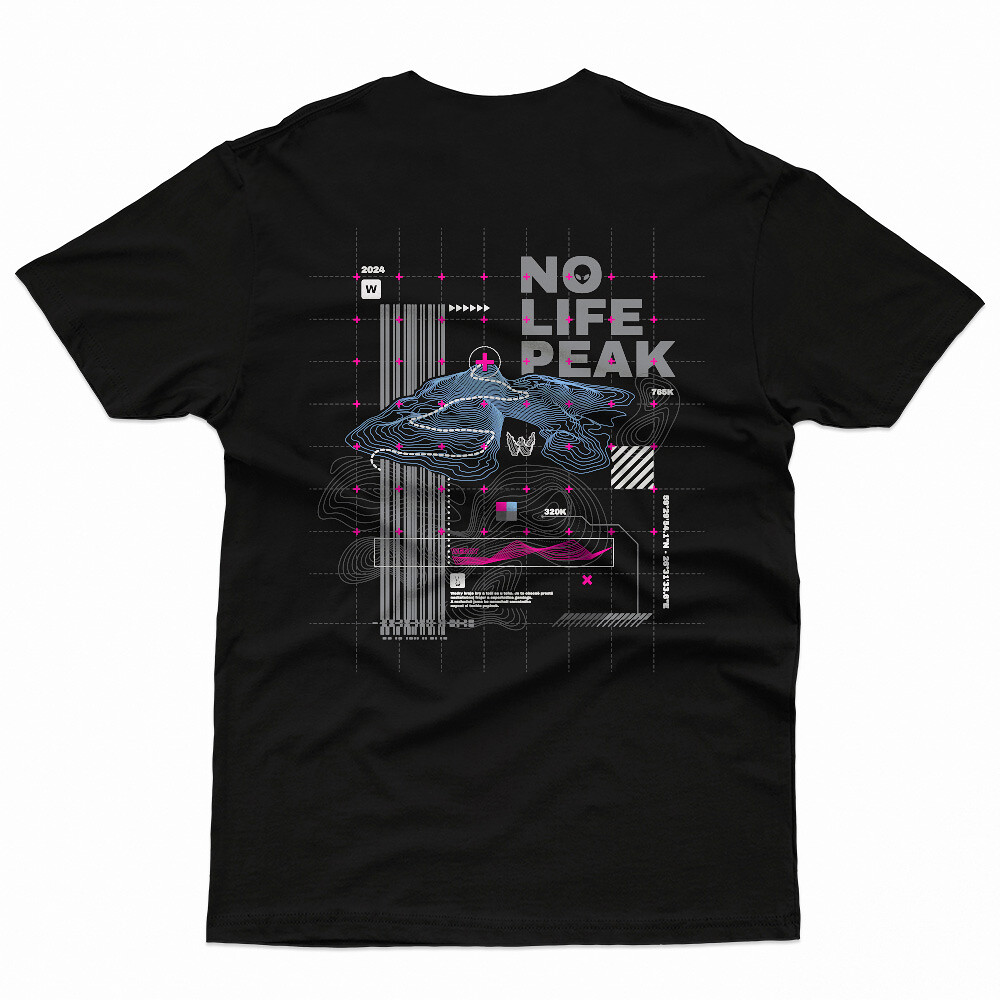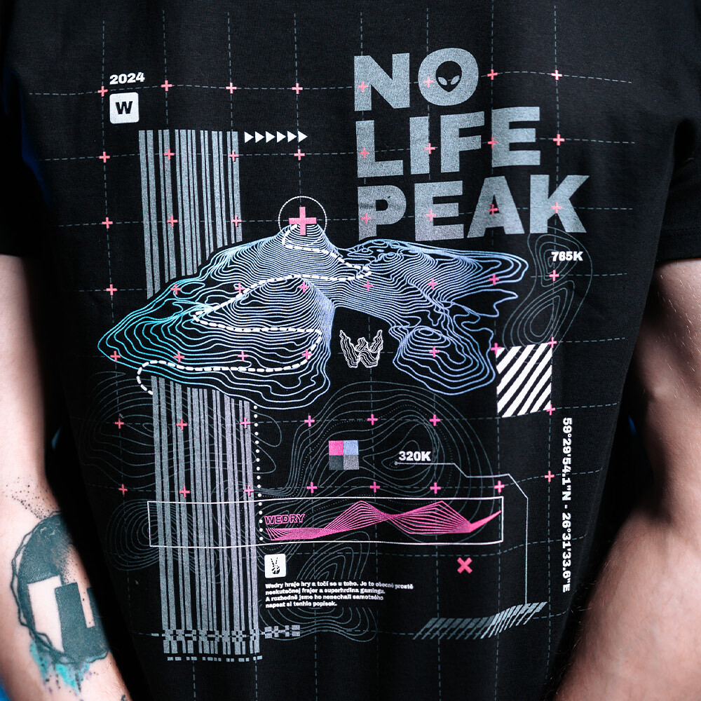 Tričko z edice Topography od youtubera Wedryho zobrazuje na zadní straně jedinečný obrázek topografické mapy vedoucí k vrcholu hory "NO LIFE". Na přední straně se nachází nápis "NO LIFE" a topograficky znázorněné písmeno W, které symbolizuje Wedryho. Tento originální design symbolizuje cestu za dobrodružstvím.