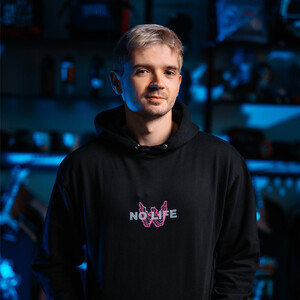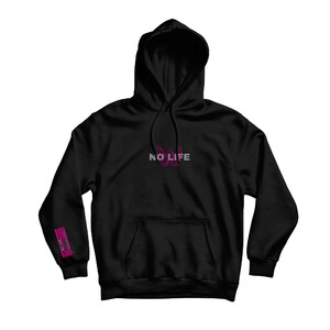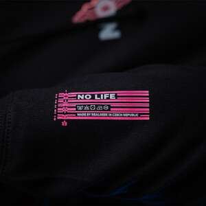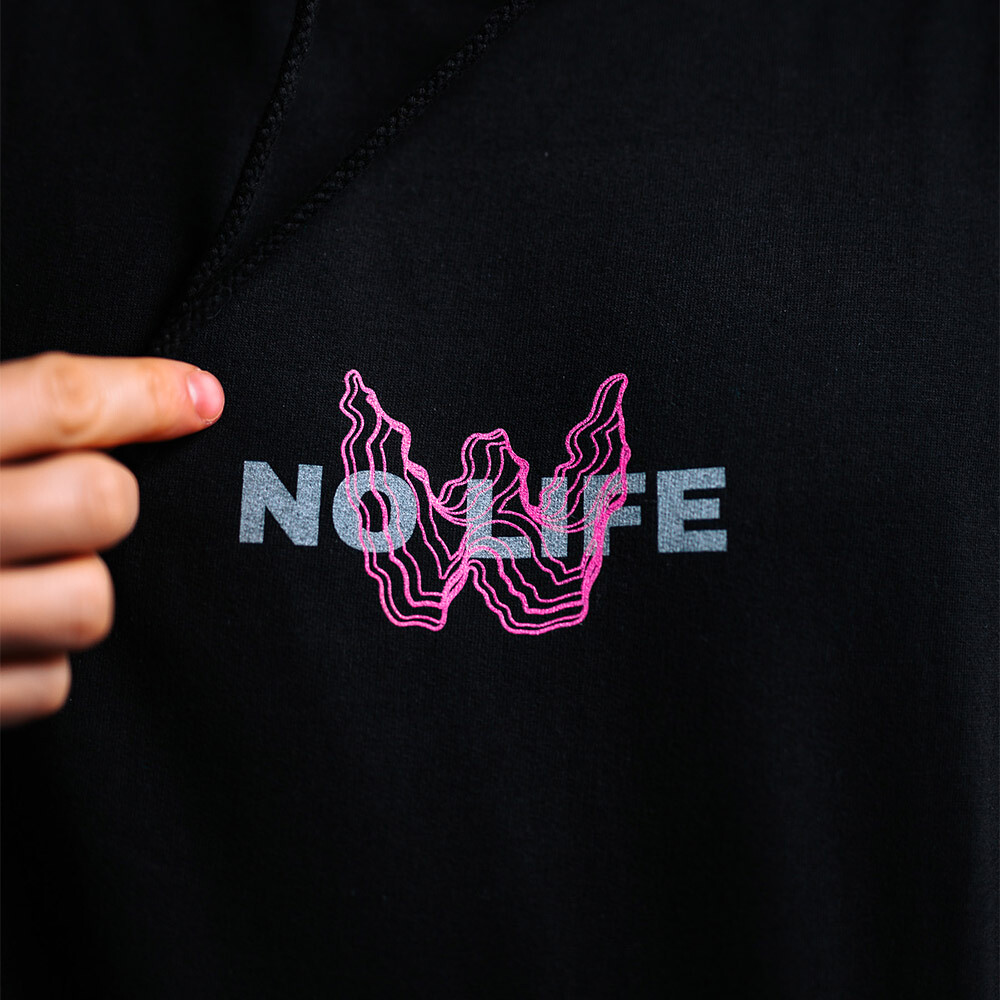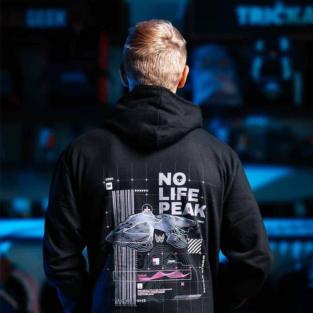 Černá mikina z kolekce Topography od Wedryho má na přední straně "NO LIFE" a topograficky ztvárněné W. Zadní strana obsahuje topografickou mapu vrcholu No Life doplněnou nápisem "NO LIFE PEAK".